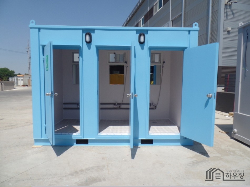 - 외벽마감재 : 철판 절곡 판넬 - 내벽마감재 : 방수코팅불연보드 - 샤워기 3SET 설치 - 바닥마감재 : 논슬립타일 |